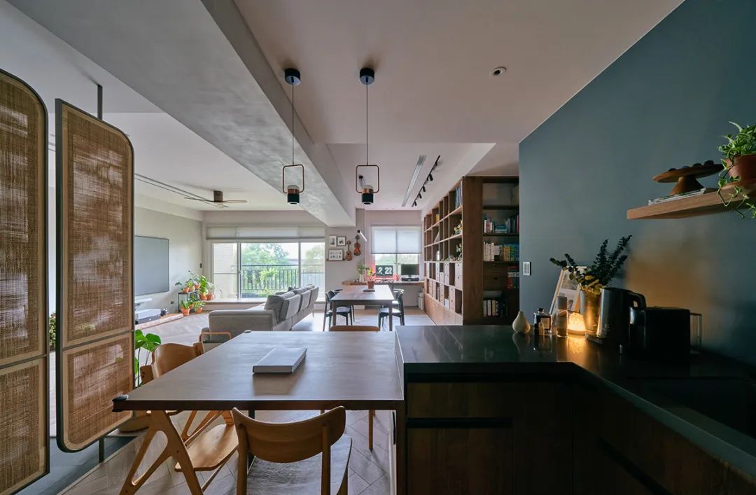 户型开门即餐厅,为了保持一定的私密性,避免“一览无余”,特意在玄关柜一侧设置了4面竹制格栅,隔断颜色与全屋的黑胡桃色系搭配起来也异常和谐。