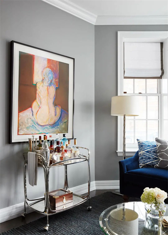 这是间不规则形状的小客厅,银色与白色的组合看起来精致高雅,尤其是在扇形落地窗赋予了空间充足的自然光的情况下。钢灰色的粗织地毯起到了功能分区的作用,同时鲜明的纹理起到了良好的装饰效果,上方叠放的不规则形状地毯丰富了层次。米克诺斯蓝的天鹅绒沙发上摆满了图案精美的靠枕,这些靠枕的色彩与空间完美契合。一对曙光银的布艺扶手椅在丰富质感的同时与周围环境构成良好的层次。