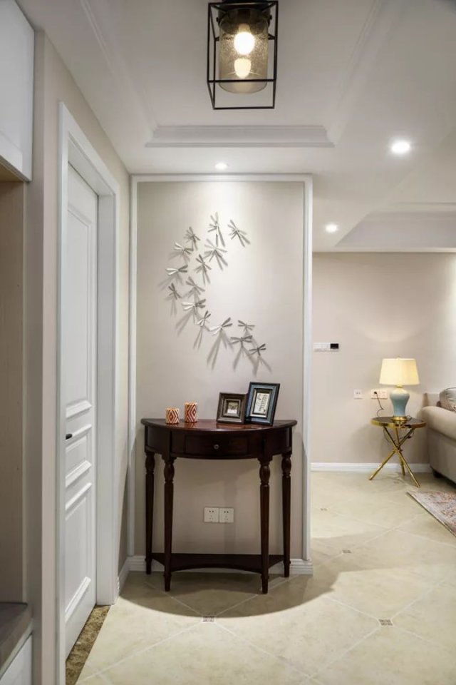 入户的玄关走廊尽头摆放了一个端景台,在端景台的上方墙面做了创意的装饰。鞋柜是做在了入户门的侧方,嵌入式的避免玄关走廊太狭窄。