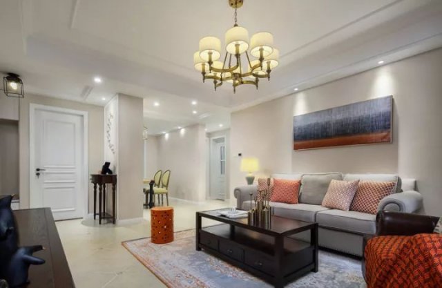 走过玄关走廊就到了客厅空间,客厅的电视背景墙带着一些乡村、复古的感觉,独特的花纹壁纸和石膏线结合,在灯光的衬托下有种特别的美感。