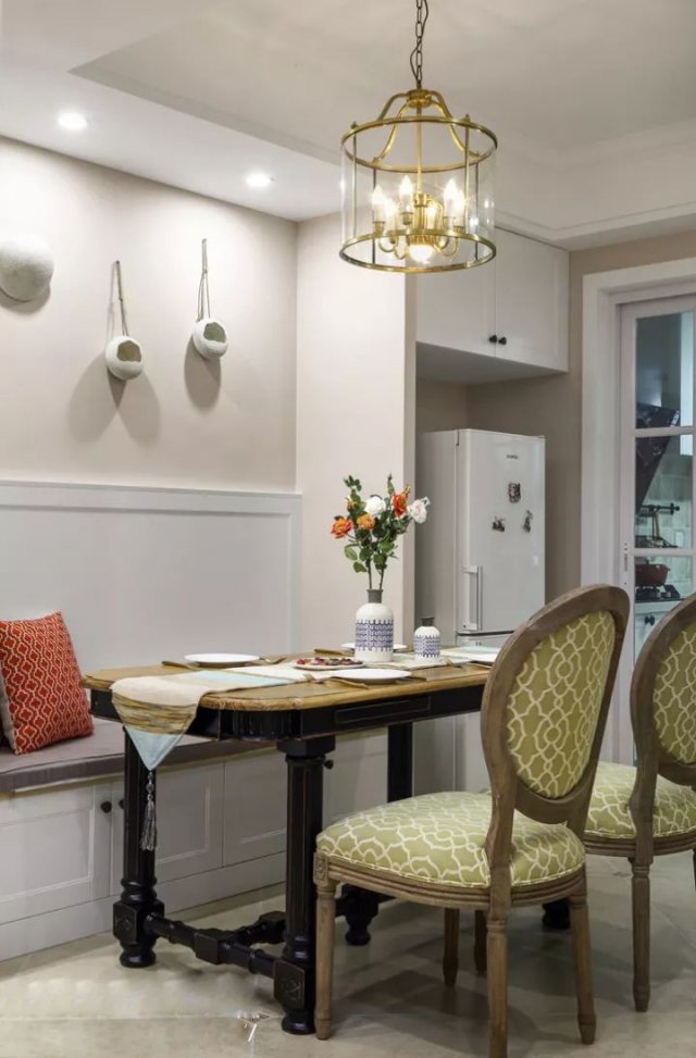 餐厅处做了卡座式的设计,卡座连着柜子,把冰箱也嵌入了柜子当中。美式风的餐桌椅给餐厅带来了典雅感,上方的吊灯也是一个亮点。