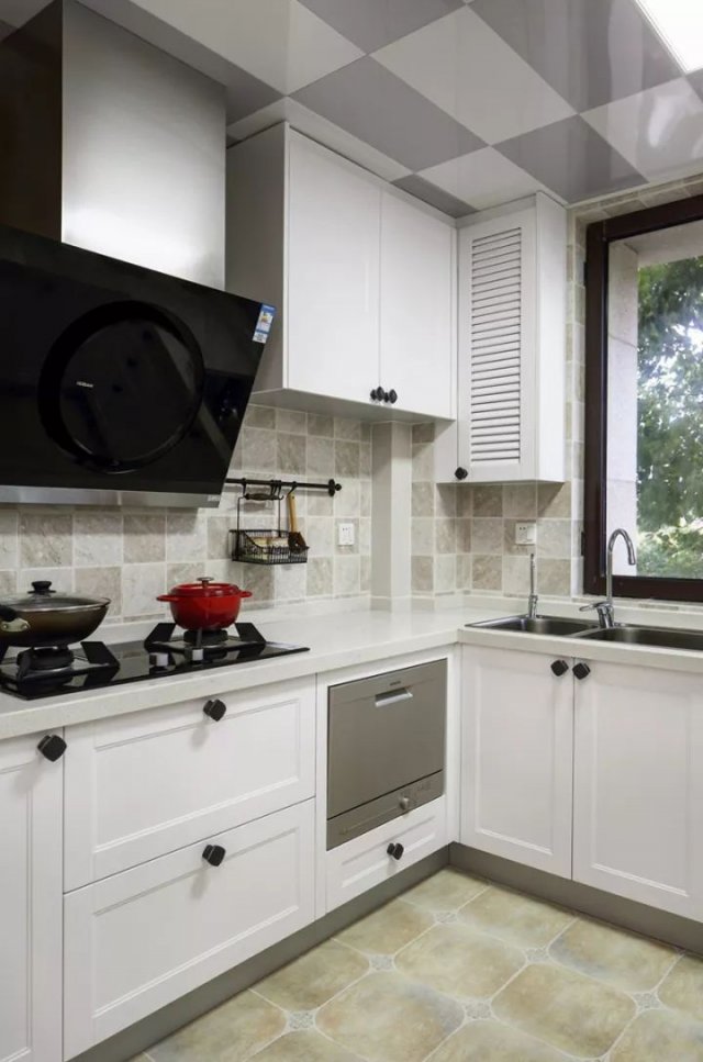 厨房内部做了U字形的橱柜布局方案,墙地面铺贴不同的仿古砖,白色的柜子带着简洁的造型,把现代感和美式风完美的融合起来,非常好看。
