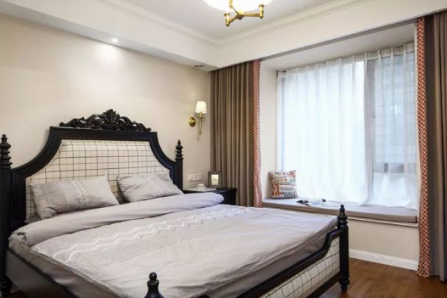 主卧室的床头背景墙同样刷成了咖色,窗帘处选择了拼色的设计,其中一层还带有花纹,结合这款黑木色的美式风的床,显得非常的大气。