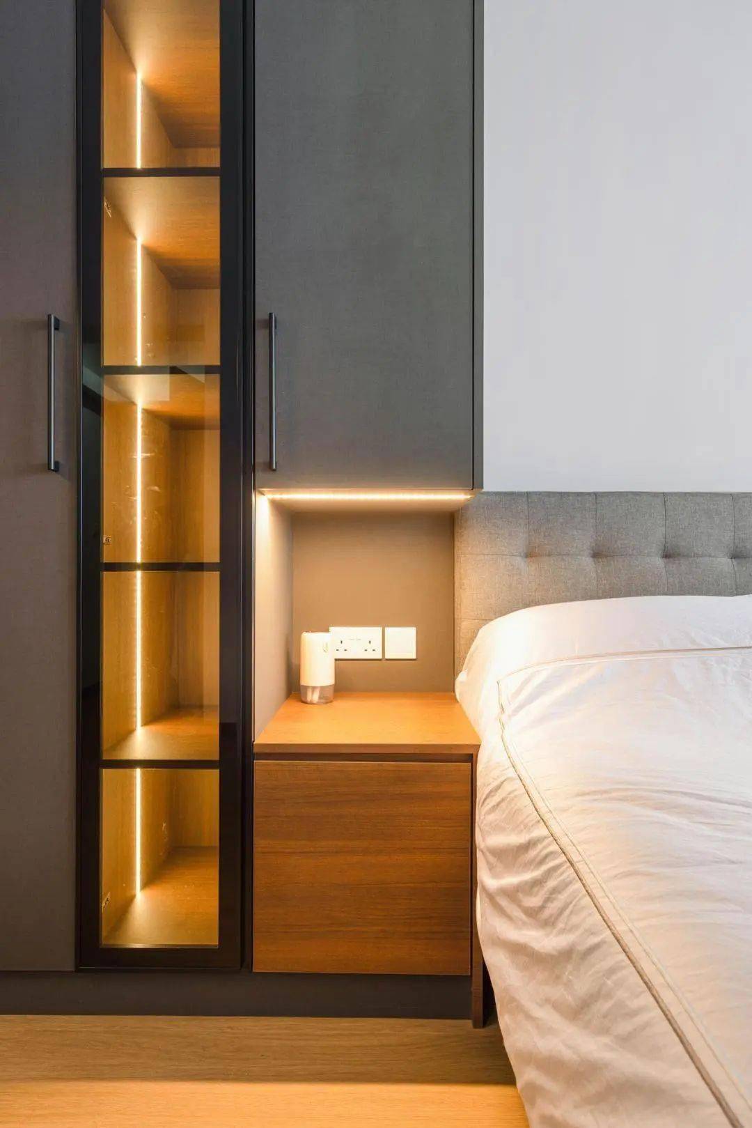 不用来收纳衣物也是可以的,床头定制收纳柜,两侧都根据插头位置设计留空置物区,也能很大程度增加收纳空间。