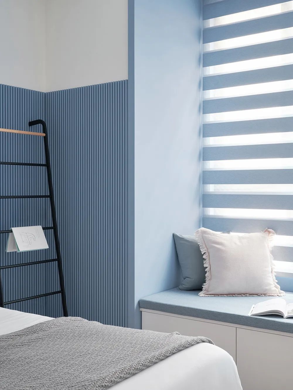 次卧以小女儿喜爱的天蓝色为基底,营造活泼氛围,外加圆弧曲线、淡蓝色百叶窗,卧室更加清爽、明快。