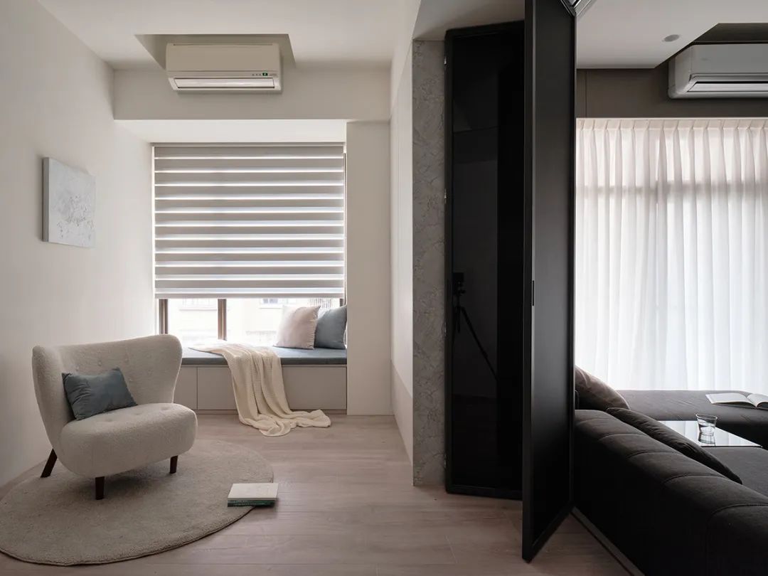 改造前,沙发后是一面实体墙,后改为折叠门。折叠门后面是一个独立房间,可以看书、独处;打开门后,便和客厅融为一体。