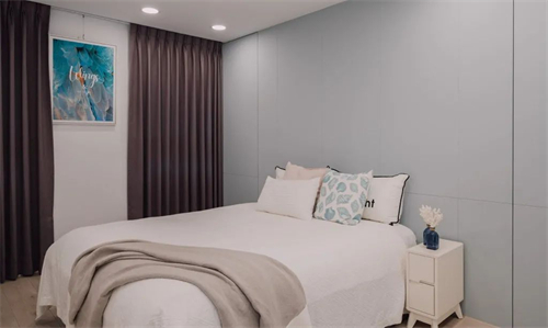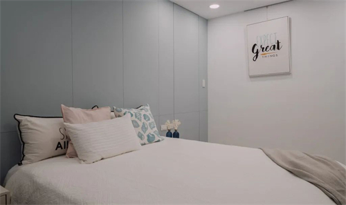 卧室简简单单,淡淡的灰蓝色做背景墙,搭配上北欧风的软装,营造舒适温馨气息。