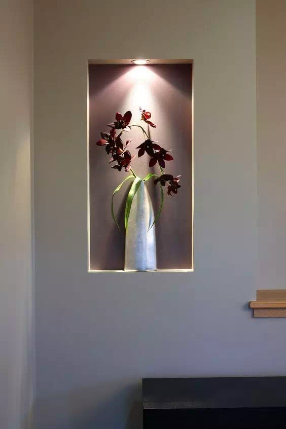 这是利用墙面做些装饰/小物收纳比较好的方法了。壁龛较早出现在宗教建筑中,用来摆佛像的。现在更常见的是用到了咱们的家中各种空间的墙壁上起装饰、收纳作用。