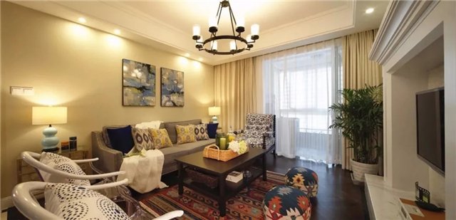 客厅沙发墙以米黄色的乳胶漆刷新,挂上2幅抽象装饰画。地面垫上一块美式怀旧图案的地毯,还有细节上优雅端庄的搭配,呈现出一个华丽高档的空间感。