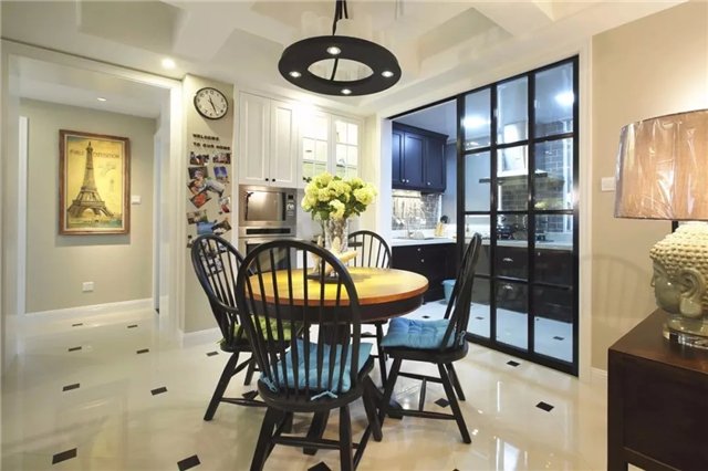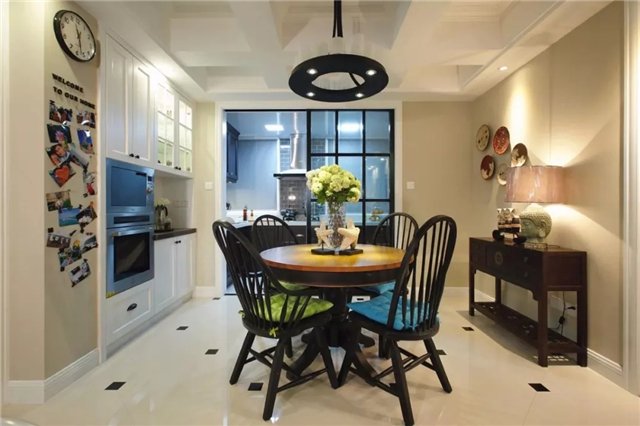 餐厅一套小资格调的圆形餐桌椅,配上一盏黑色圆形的吊灯,灯光打在餐桌上,围着一瓶鲜花,营造出浪漫情调的氛围。