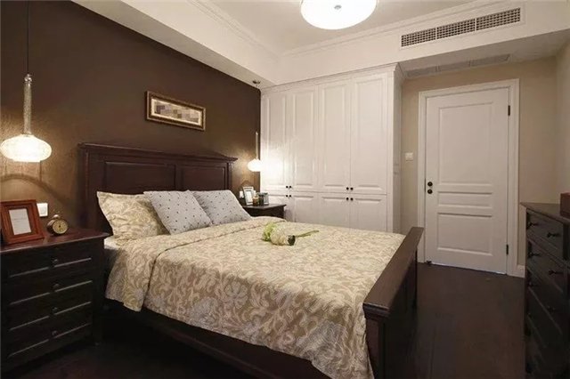 卧室的背景墙(包括床体)与地面以深色的为主,而白色衣柜、天花与房门,还有浅色的墙面与床单,通过对比搭配,呈现出的空间是稳重而轻松。