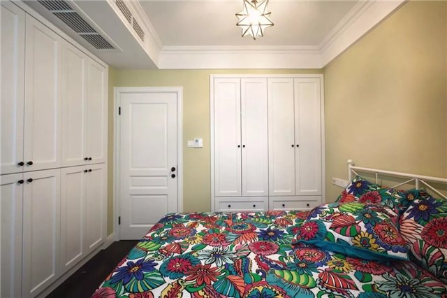 次卧墙体以淡淡的茶绿色,白色的房门与衣柜,搭配一款鲜艳花纹的床单,还有一盏星状的吊灯,这个空间简简单单而又实用优雅自然。