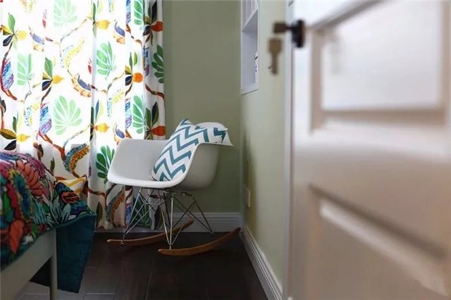 窗帘也是选择带有鲜艳植物图案的,靠窗角落布置一张小鸡蛋椅,后方墙面挖空做个小书架,为主人提供了个惬意舒适的阅读角落。