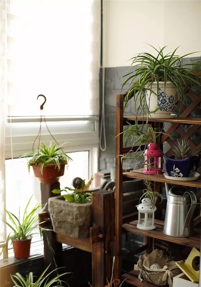 阳台采用比较粗犷的石材质感作为墙面材质,同时搭配一只石材的花瓶,结合上绿植的衬托,显得格外的清新、亲近自然。