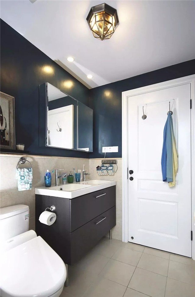 紧凑的卫生间在合理的布局下,墙角贴砖+墙身深色防水漆的做法,然后马桶旁的墙上挂着几幅装饰画,很是优雅端庄。
